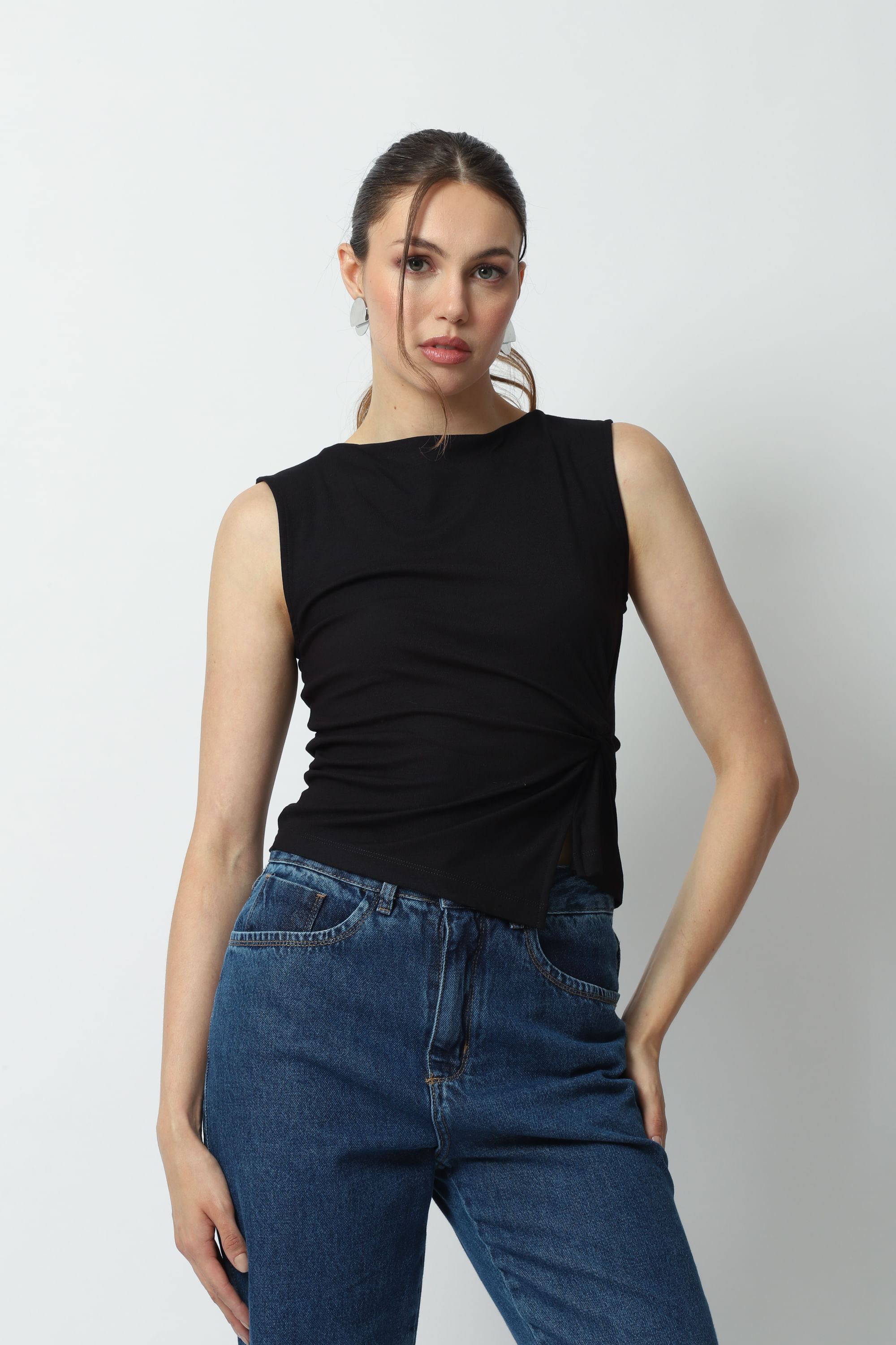 Regata com detalhe de torção, frente com abertura assimétrica e comprimento regular. Blusa confeccionada em uma malha canelada com uma mistura de viscose e elastano, com toque macio e sedoso e efeito anti pilling que não forma bolinha.