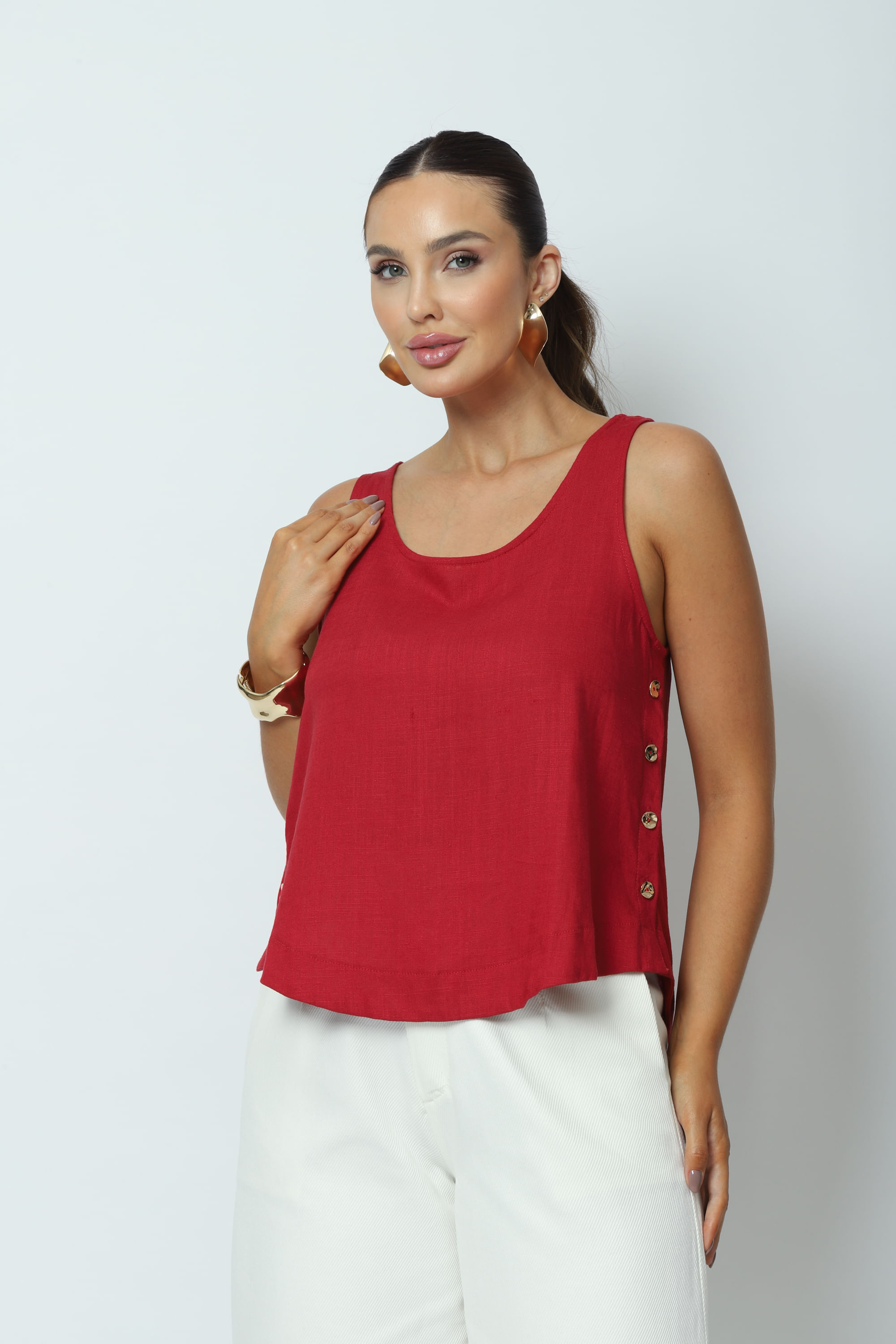 Descrição Regata soltinha, barra arredondada, com frente ligeiramente mais curta, alças largas e o destaque da regata fica nas laterais, com botões em dourado. Confeccionada em uma mistura de viscose e linho.