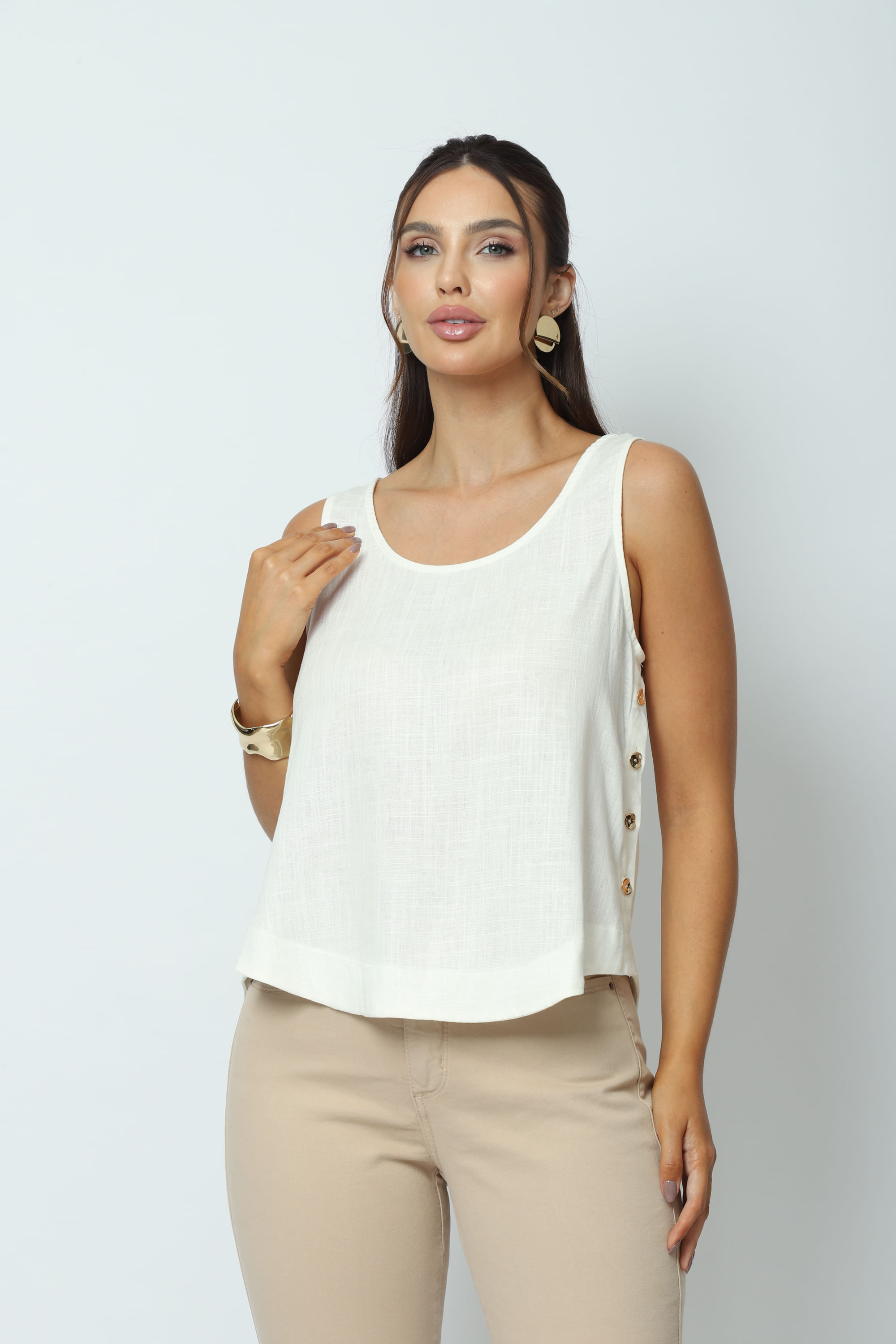 Descrição Regata soltinha, barra arredondada, com frente ligeiramente mais curta, alças largas e o destaque da regata fica nas laterais, com botões em dourado. Confeccionada em uma mistura de viscose e linho.