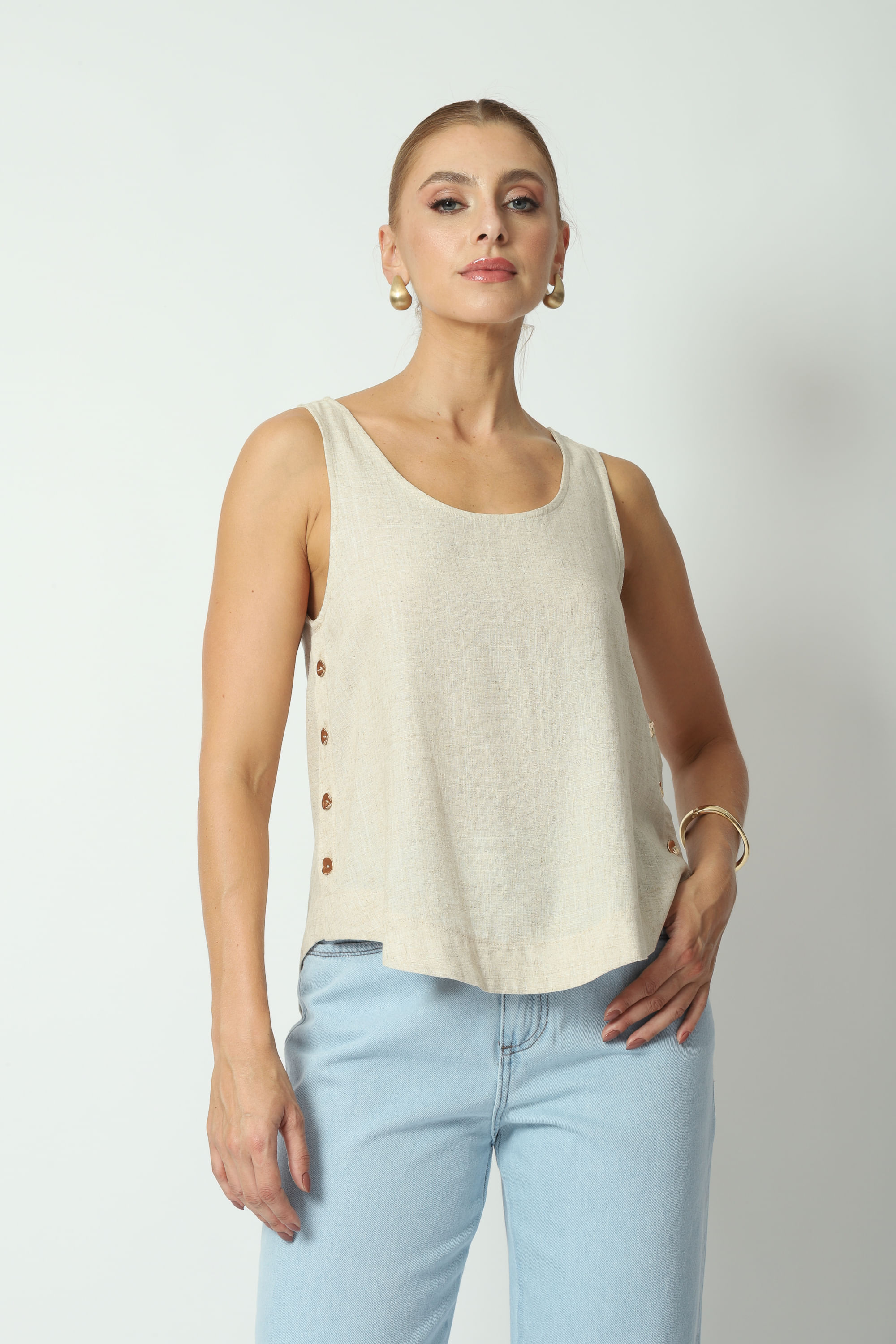 Descrição Regata soltinha, barra arredondada, com frente ligeiramente mais curta, alças largas e o destaque da regata fica nas laterais, com botões em dourado. Confeccionada em uma mistura de viscose e linho.