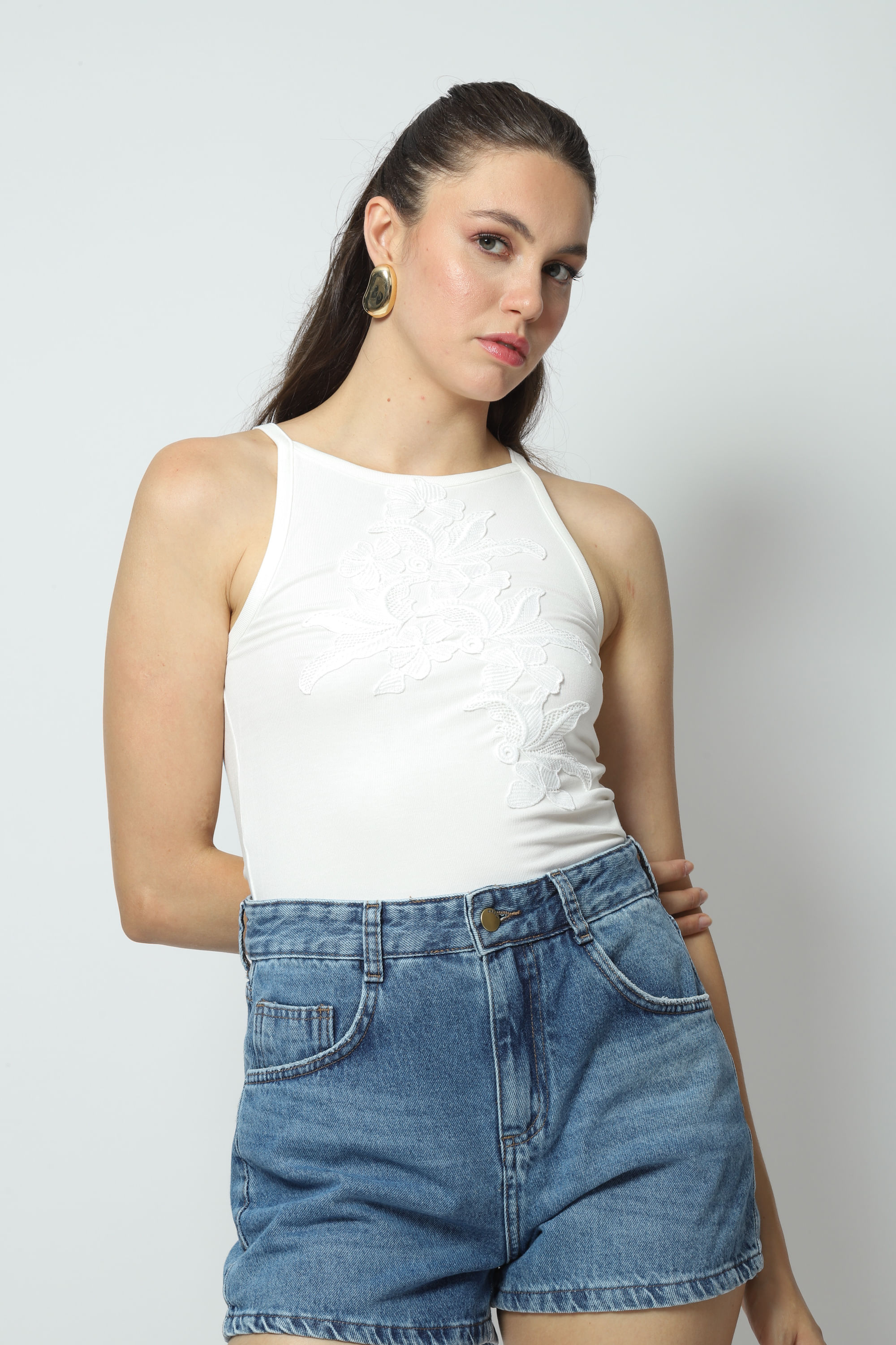 Regata canelada, alças finas, decote fechado, aplique de flor na frente, comprimento regular e modelagem justinha ao corpo. Confeccionada em malha canelada com mistura de viscose e elastano , toque macio e sedoso e efeito anti pilling que não forma bolinha.
