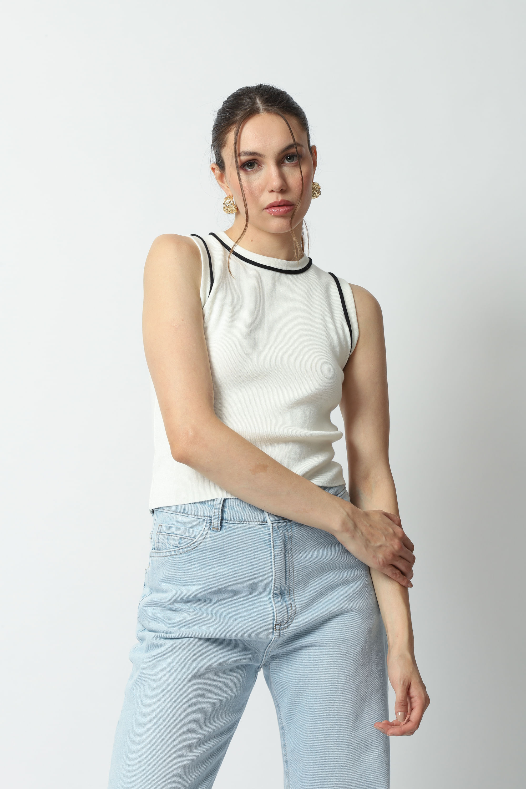 Descrição Regata tricot, alças largas, gola redonda, comprimento regular, detalhe nas cavas e e gola. Confeccionada em tricot canelado com toque extremamente macio.