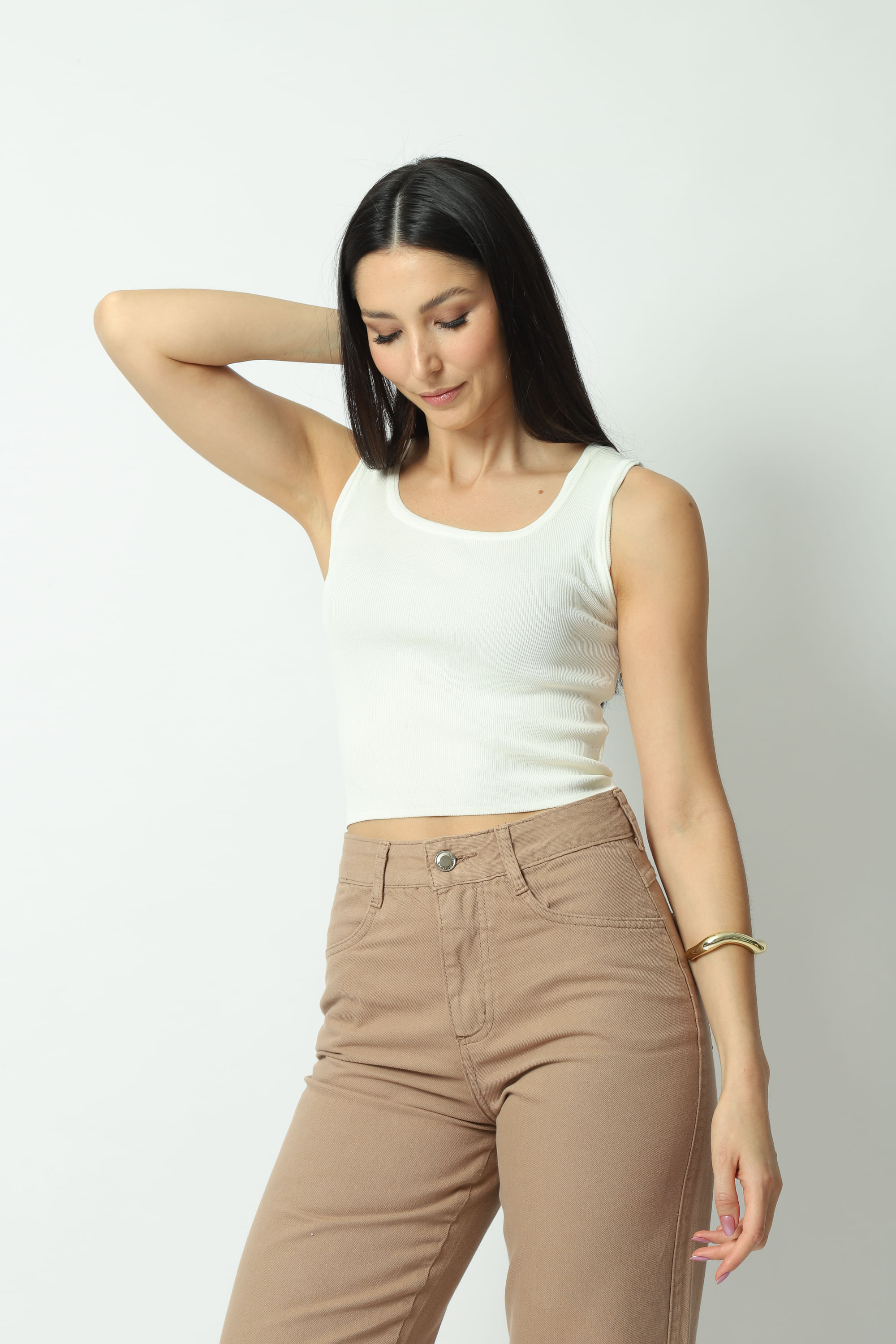 Descrição Regata tricot canelado, alças largas, gola redonda e comprimento cropped. Confeccionada em tricot de malha fria, com uma mistura de viscose, poliéster e poliamida.