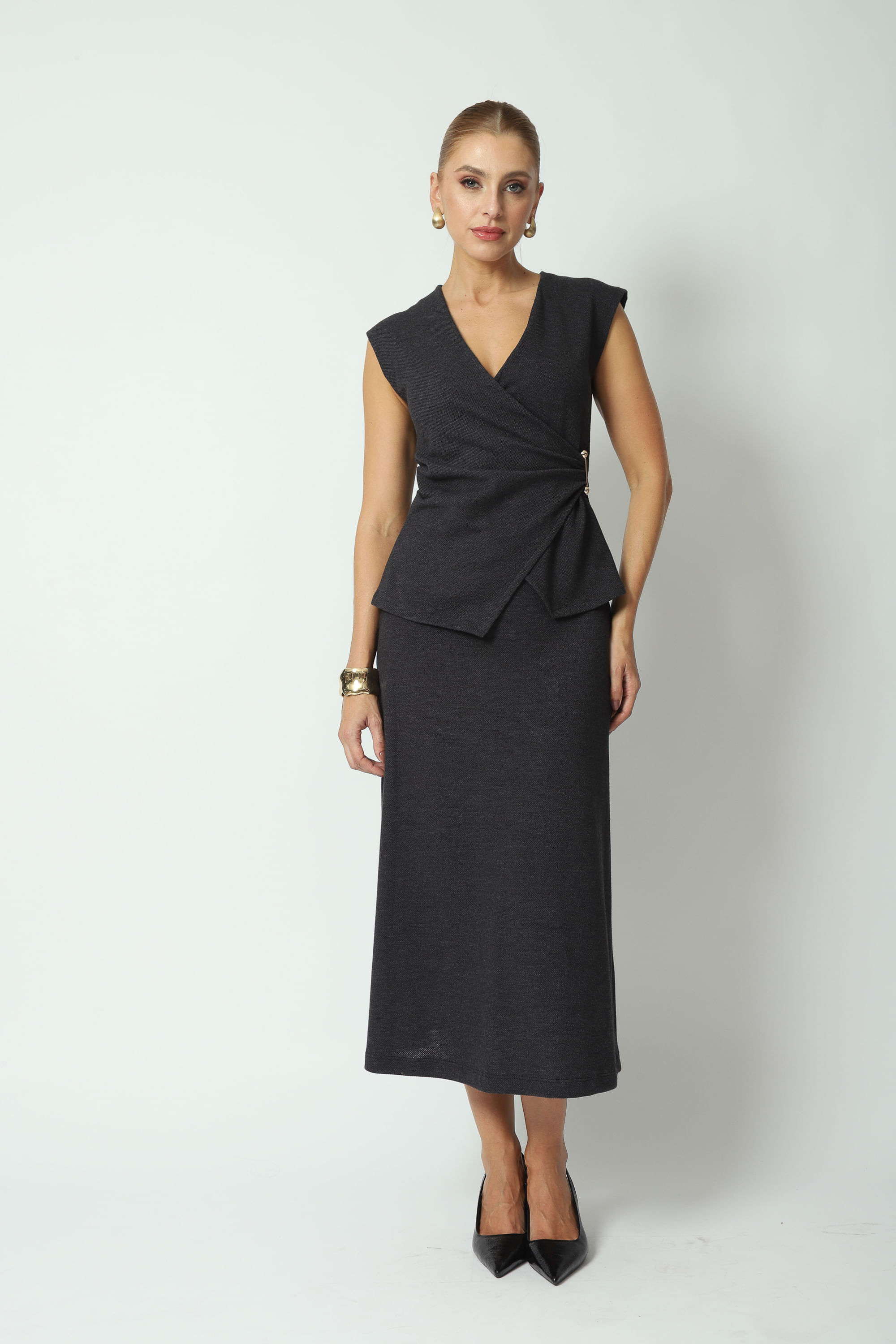 Descrição Saia texturizada, modelagem evasê que proporciona um caimento elegante e fluido, comprimento midi, elástico no cós e fechamento lateral por zíper.
