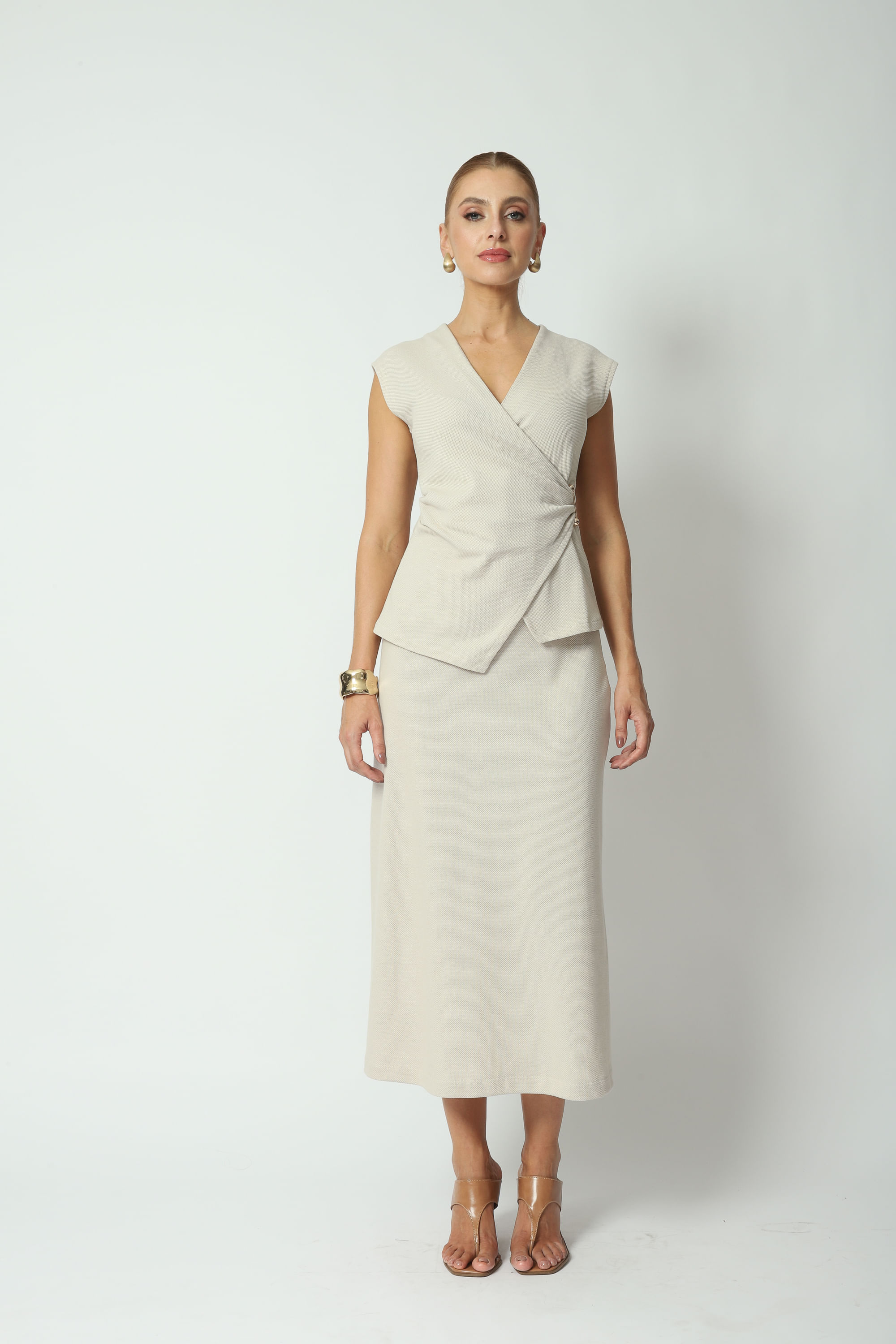 Saia texturizada, modelagem evasê que proporciona um caimento elegante e fluido, comprimento midi, elástico no cós e fechamento lateral por zíper.