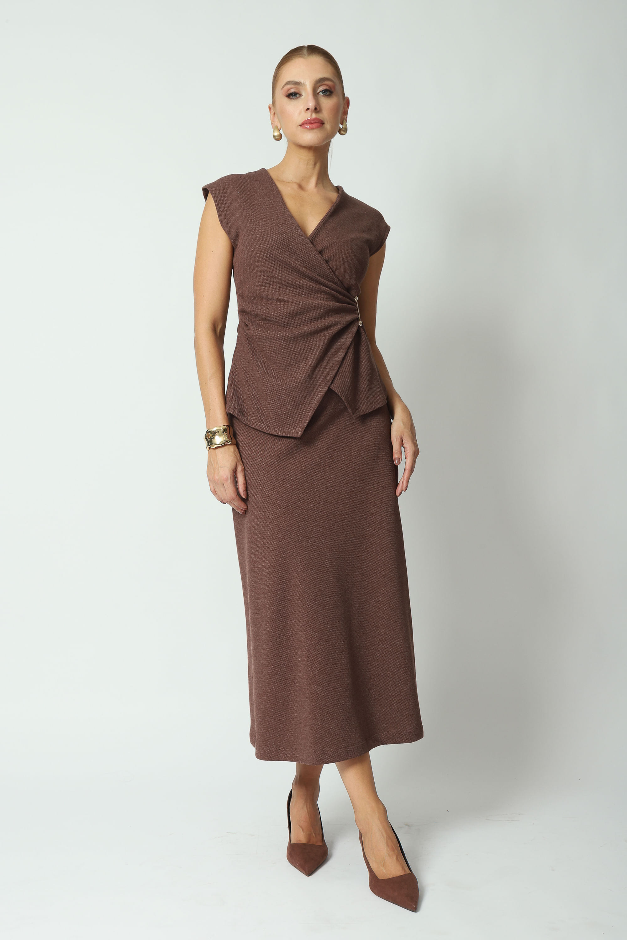 Saia Midi Evase Texturizada Marrom