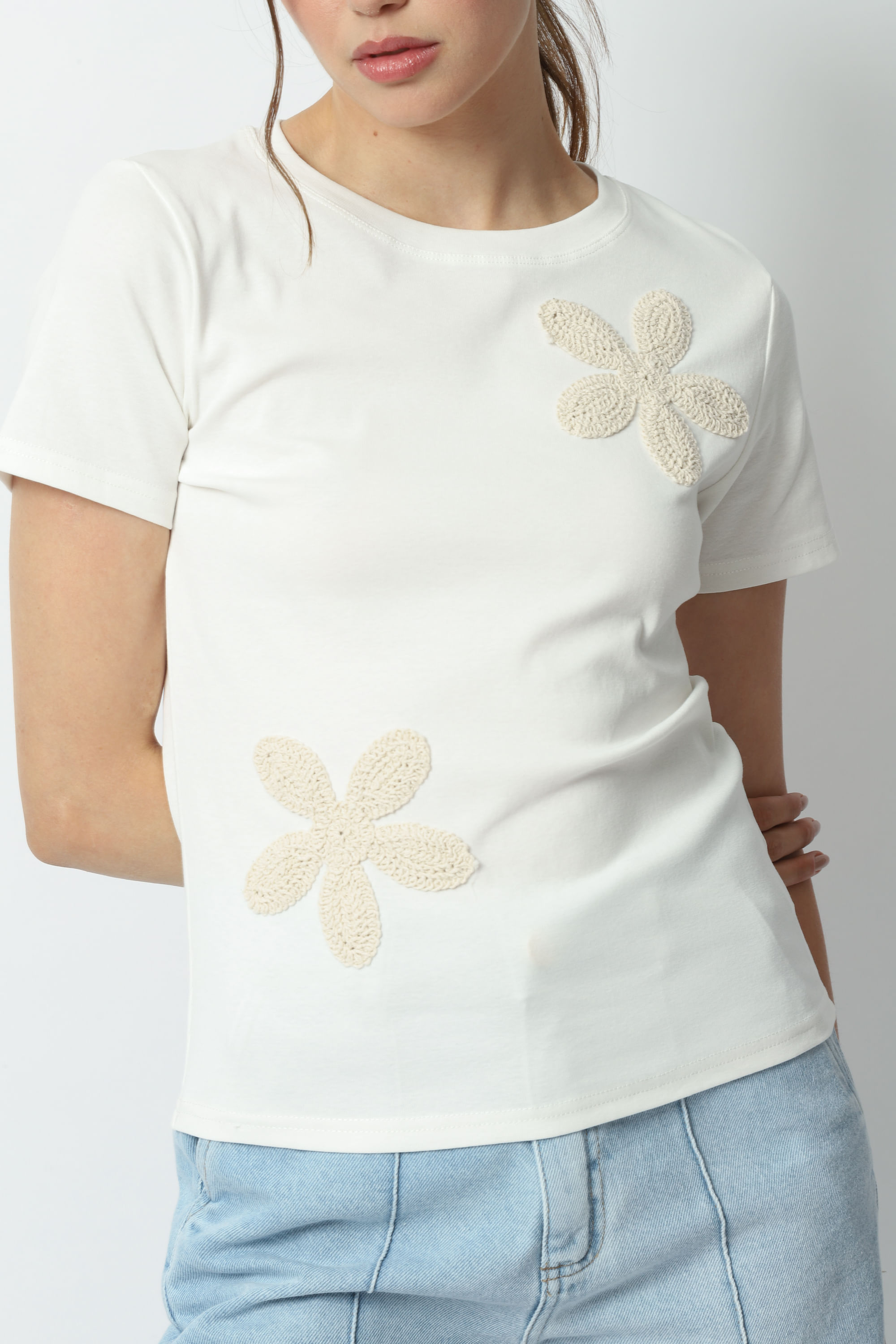 Descrição T-shirt trabalhada com aplique de flores em crochê, gola redonda, comprimento regular, manga curta e modelagem reta. T-shirt confeccionada em uma mistura de algodão com elastano.