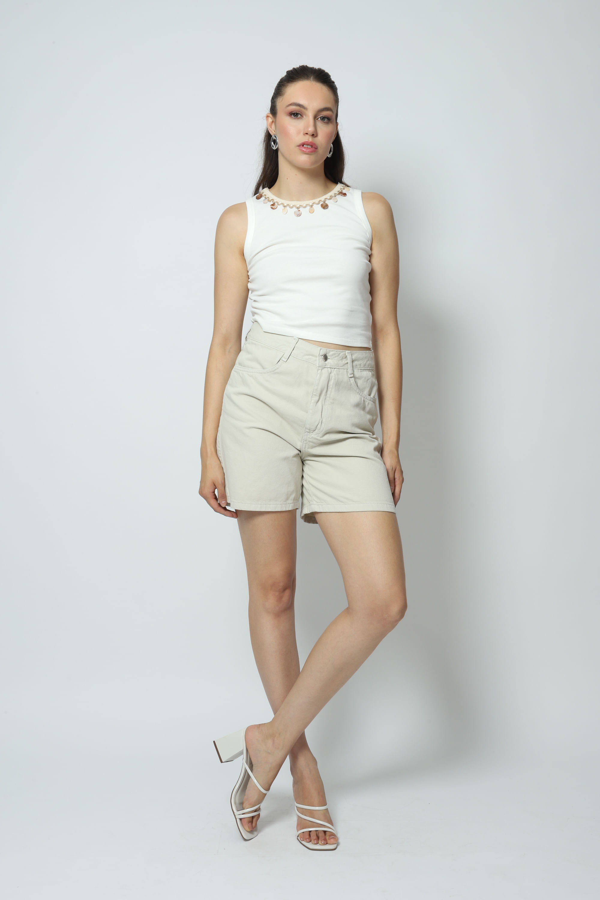Shorts sarja cintura alta, comprimento meia coxa, 4 bolsos, fechamento frontal por zíper e botão, passantes para cinto. Sarja sem elasticidade, 100% Algodão.