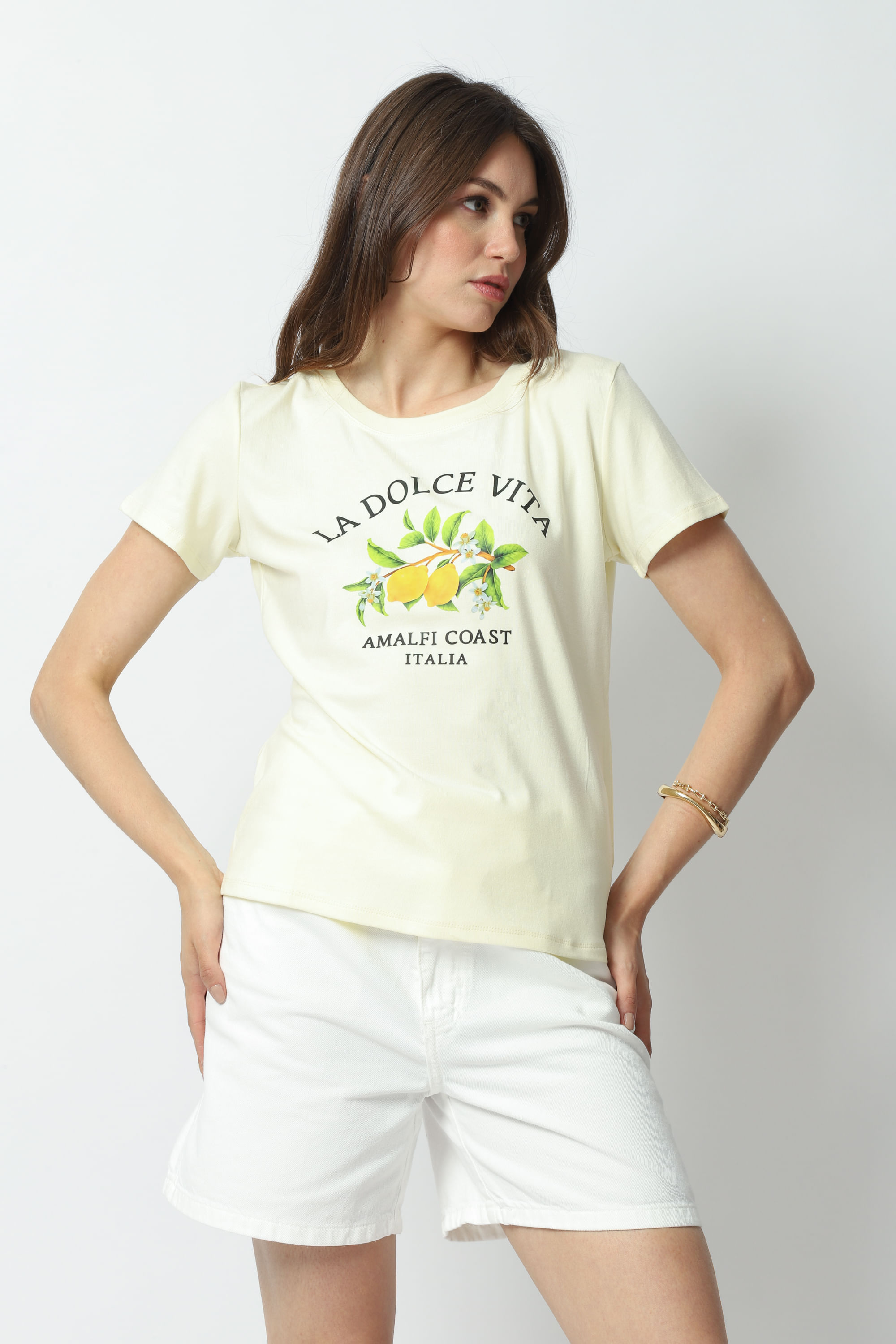 T-Shirt com estampa inspirada no charme da costa italiana, Confeccionada em malha leve e macia, ela traz estampa com limões sicilianos e escrito La Dolce Vita" e "Amalfi Coast Italia". Com modelagem reta, soltinha no corpo, gola redonda e mangas curtas. É aquela peça que é a cara do verão.