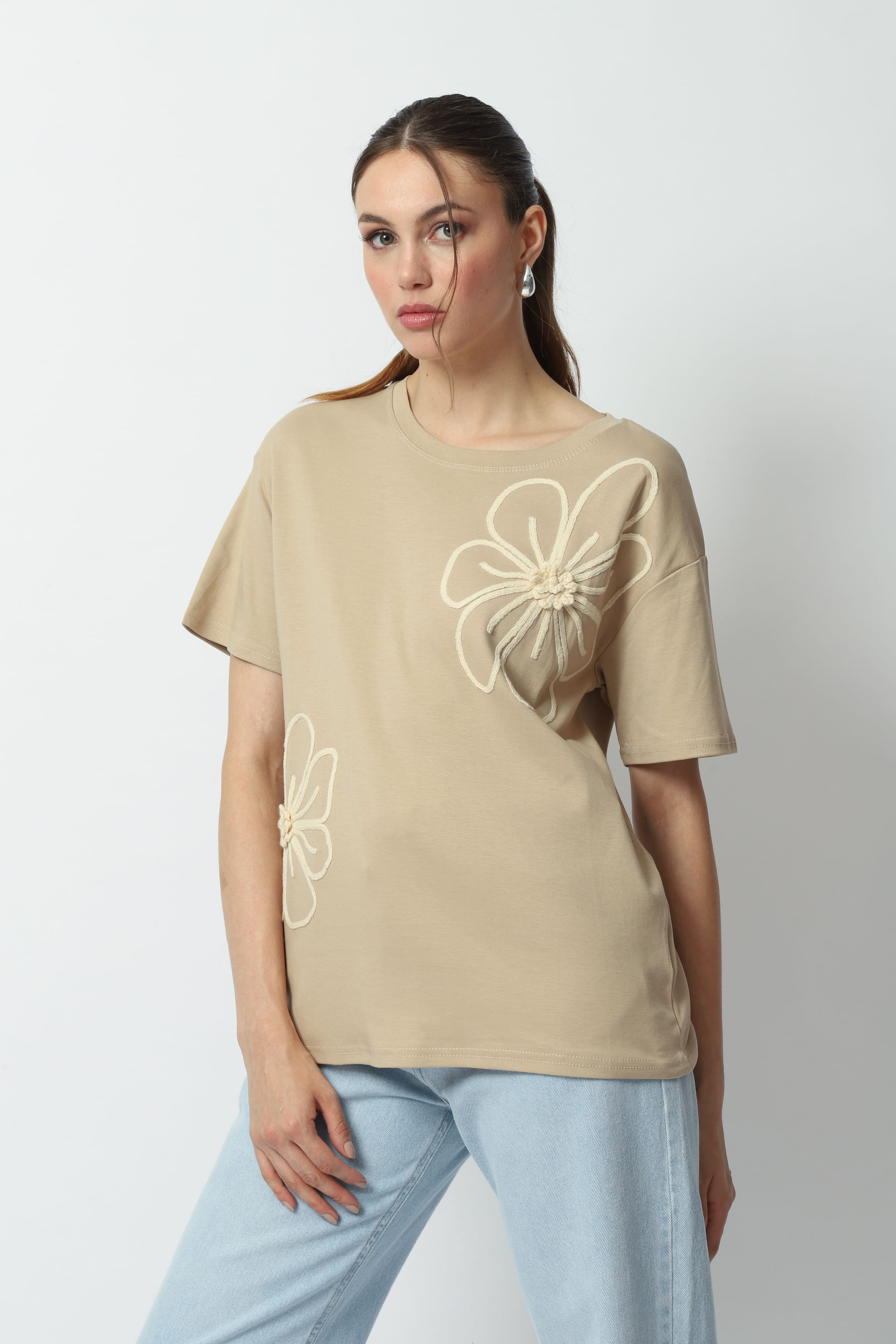 T-shirt trabalhada com flor bordada, gola redonda, comprimento regular, manga curta e modelagem reta com caimento solto. Confeccionado em algodão peruano, conhecido pela sua suavidade e durabilidade. Maciez e brilho sedoso.
