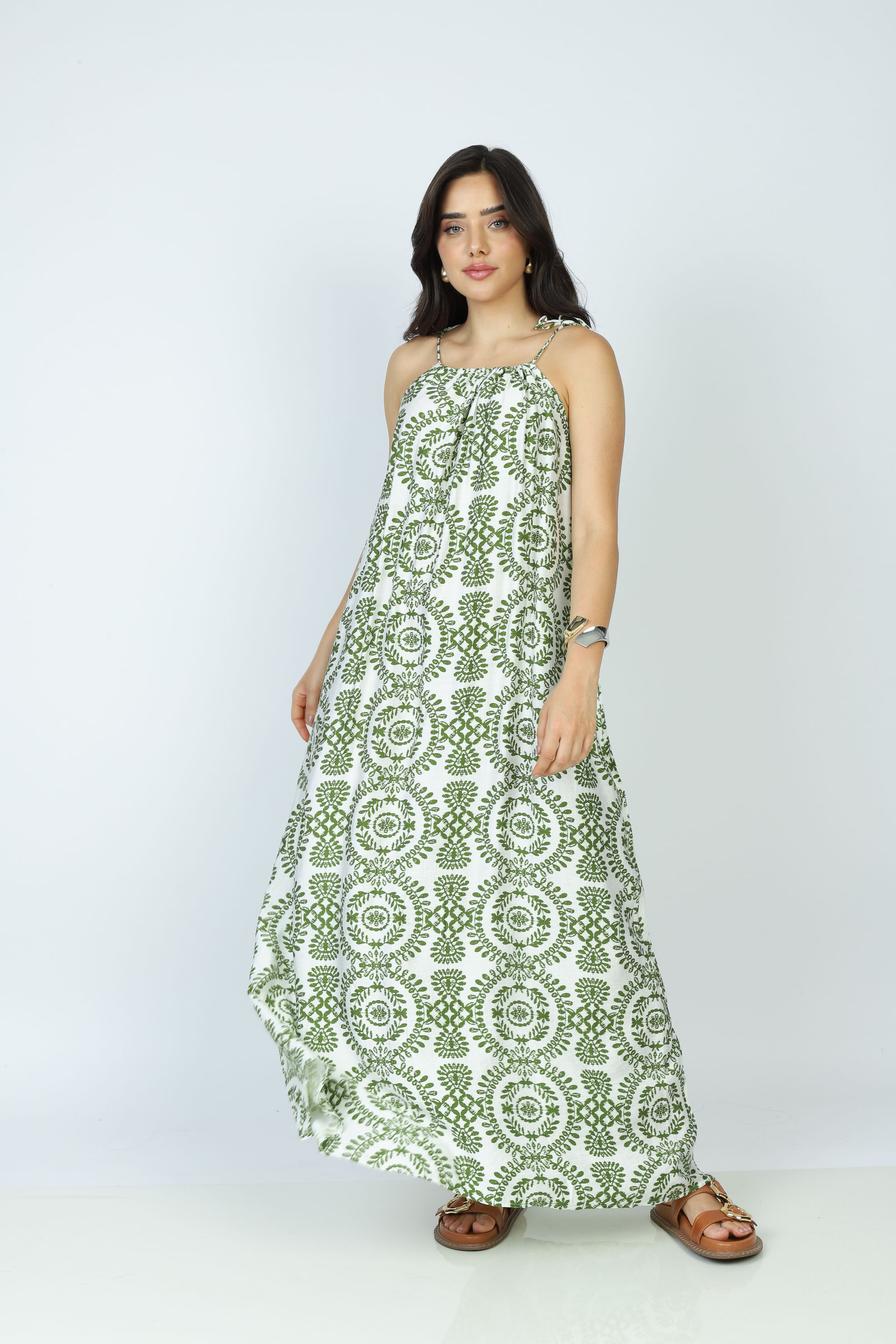 Vestido estampado, comprimento longo, decote cortininha frente e costas, alças finas com amarração, modelagem solinha. Possui um tecido leve e com caimento fluído.