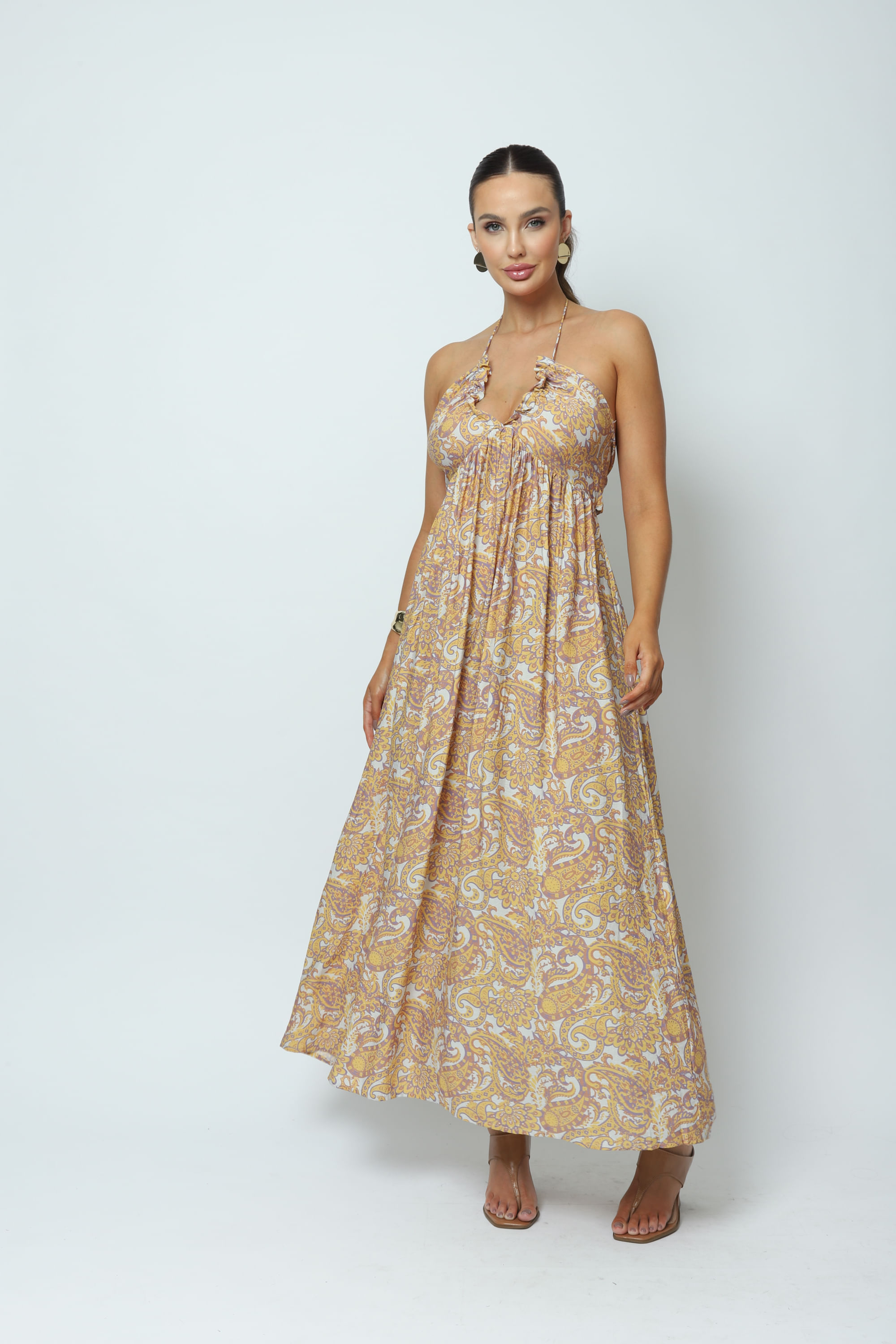 Descrição Vestido estampado de comprimento longo, amarração no pescoço e costas, decote V ajustável com babado, elástico nas costas para um ajuste perfeito. Modelagem soltinha, confeccionada em um tecido leve e fluído.