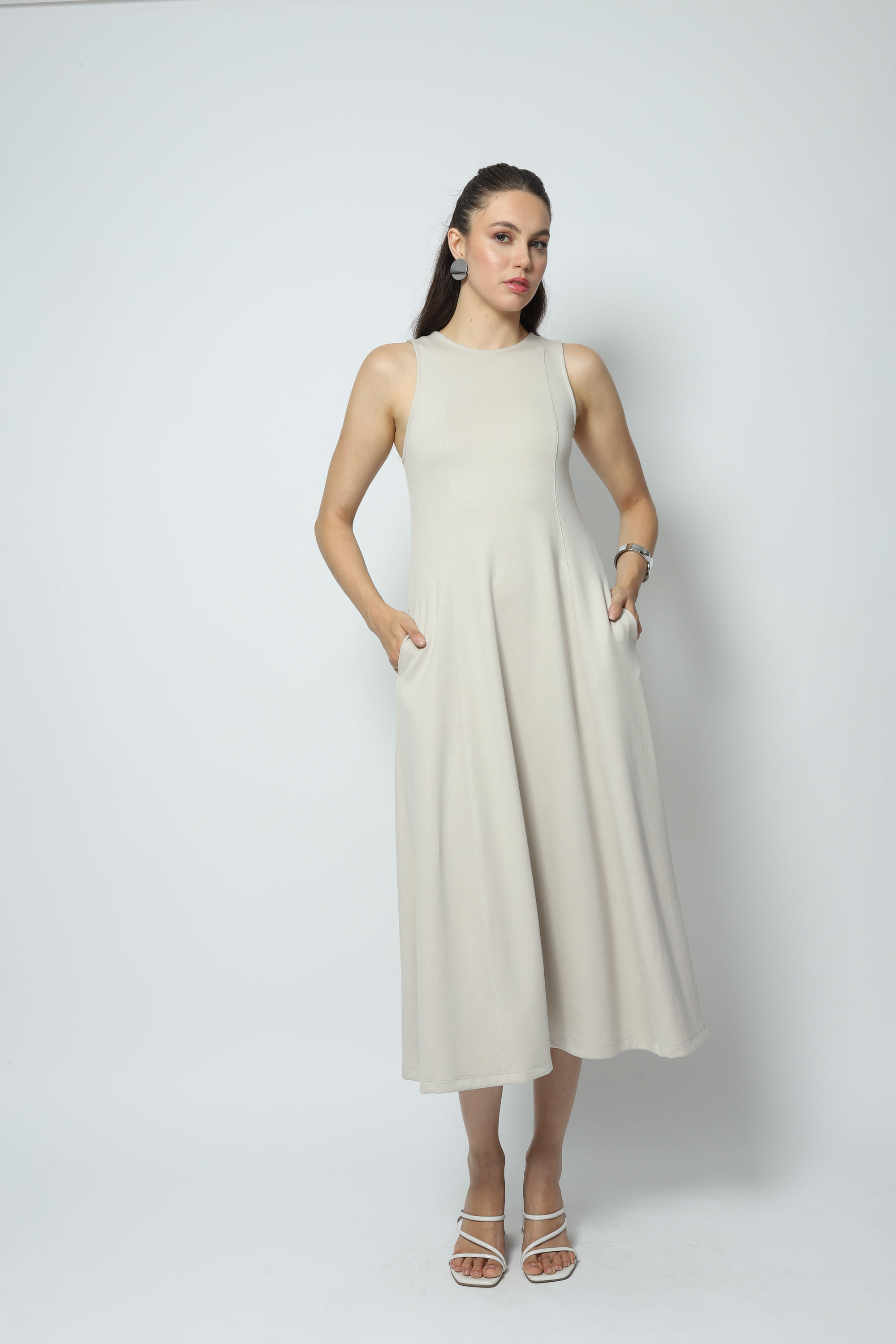 Vestido de malha comprimento midi, sem manga, alças largas, decote redondo e possui bolsos. A peça traz busto justo ao corpo com recortes princesa abrindo evasê até a barra. O evasê adiciona movimento à peça, proporcionando uma silhueta encantadora. Confeccionado em uma malha com mistura de viscose e elastano.